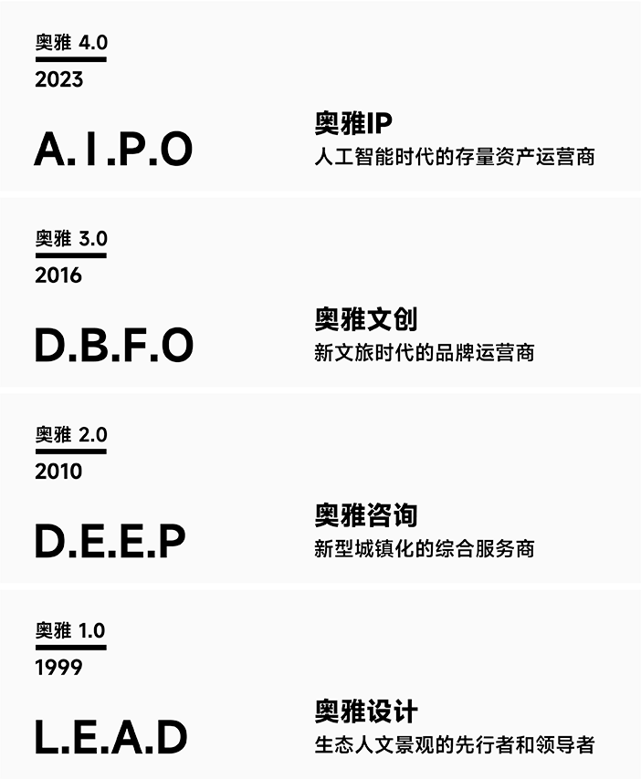 經過多年的戰(zhàn)略布局與發(fā)展,在李方悅女士的推動下,奧雅股份從一家設計企業成功轉型成為新銳的輕資產文旅開發(fā)運營企業。奧雅以“創(chuàng)造更美好的人居環(huán)境”“讓空間賦予生命”為使命,以雙輪驅動+雙引擎為發(fā)展格局,即創(chuàng)意設計+親子文旅雙輪驅動、AIGC+IP雙引擎;經營業務范圍涵蓋創(chuàng)意設計、親子文旅、數字科技等領域,為城市更新、鄉村振興、文化古城等不同場景提供全程化咨詢與綜合運營服務。在實現企業價值和理想的同時,解決當代中國的實際問題與需求,創(chuàng)造具有地域特色、人性化和充滿活力的新舊城市空間和綜合文化旅游項目。